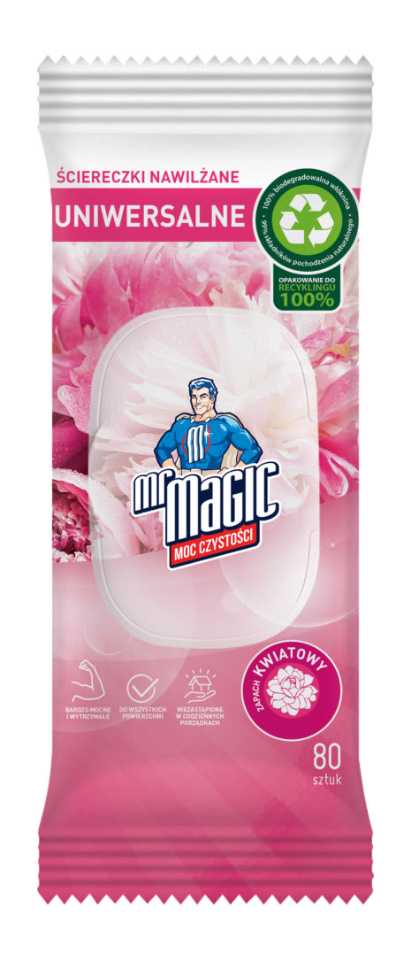 W trosce o środowisko zmieniliśmy materiał ściereczki na 100% biodegradowalny. Odchudzone opakowanie wykonane jest z jednorodnego materiału i w całości nadaje się do recyklingu. Dzięki temu ograniczamy wprowadzanie plastiku do środowiska. Praktyczne ściereczki nawilżane Mr Magic do przecierania różnych gładkich powierzchni zmywalnych (np. z tworzyw sztucznych, płyt MDF, glazury, kamienia) nasączone są uniwersalnym płynem czyszczącym, który skutecznie usuwa bieżące zabrudzenia i odświeża przecierane powierzchnie, pozostawiając przyjemny zapach.