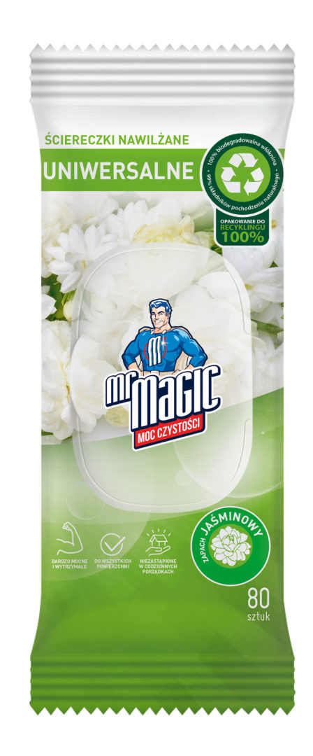 W trosce o środowisko zmieniliśmy materiał ściereczki na 100% biodegradowalny. Odchudzone opakowanie wykonane jest z jednorodnego materiału i w całości nadaje się do recyklingu. Dzięki temu ograniczamy wprowadzanie plastiku do środowiska. Praktyczne ściereczki nawilżane Mr Magic do przecierania różnych gładkich powierzchni zmywalnych (np. z tworzyw sztucznych, płyt MDF, glazury, kamienia) nasączone są uniwersalnym płynem czyszczącym, który skutecznie usuwa bieżące zabrudzenia i odświeża przecierane powierzchnie, pozostawiając przyjemny zapach.